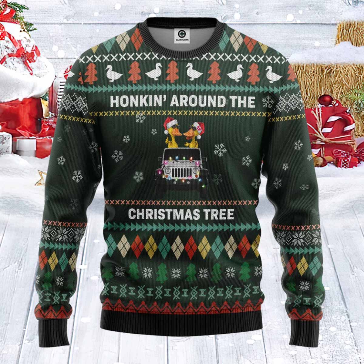The holiday season is upon us, and what better way to celebrate than with a unique and humorous twist on the classic ugly Christmas sweater? Introducing the Duck Honkin Around The Christmas Tree Ugly Christmas Sweater – a perfect blend of festive cheer and quirky charm that is sure to make you the center of attention at any holiday gathering.